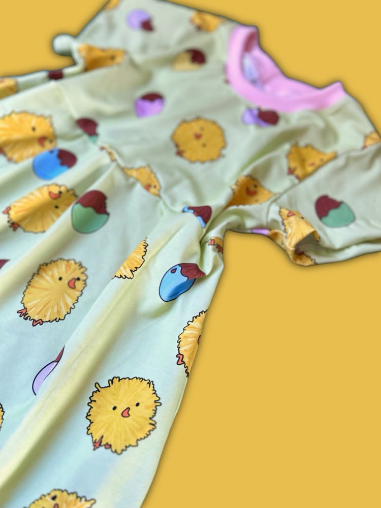 Soft and stretchy limited edition Fluffy Chicks dress, perfect for egg hunting! just pick which sleeves you want.